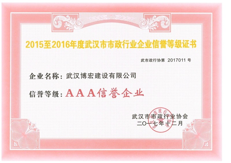 2015-2016市市政行業AAA信用等級證書